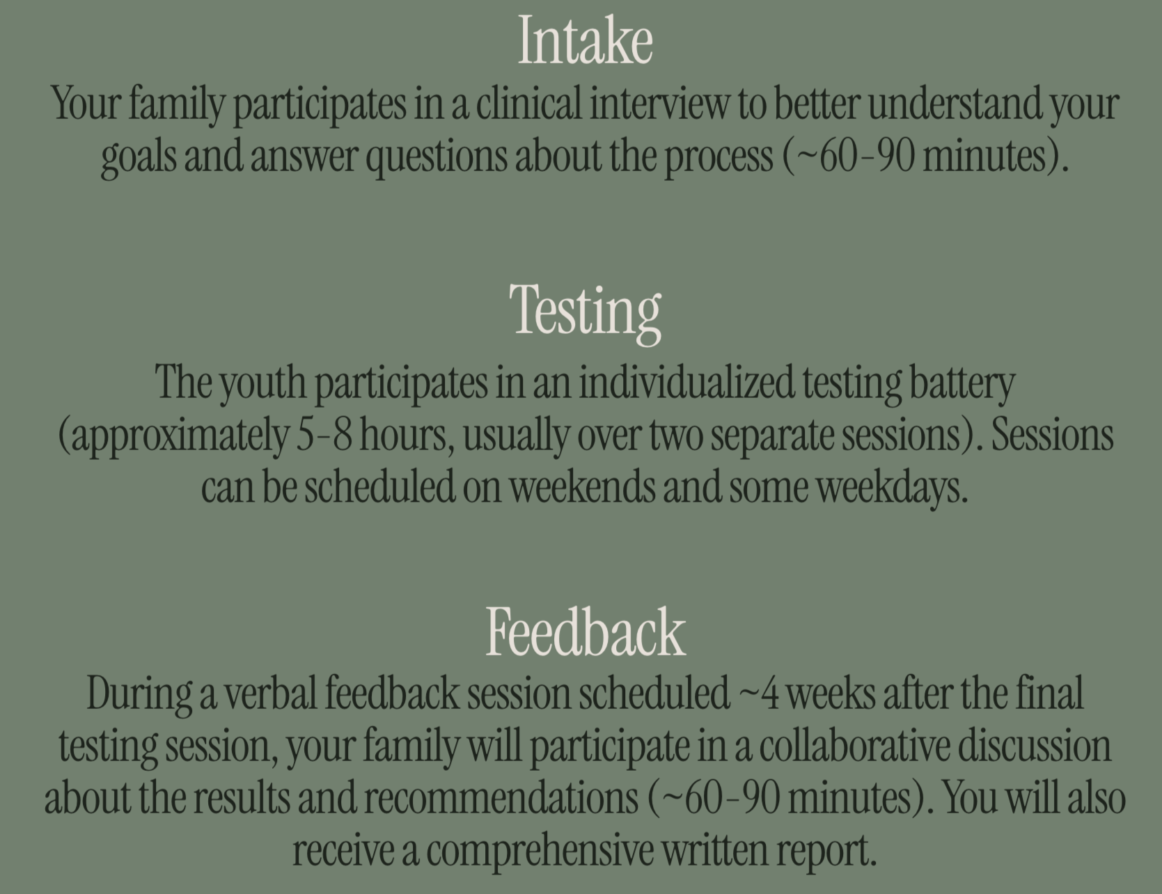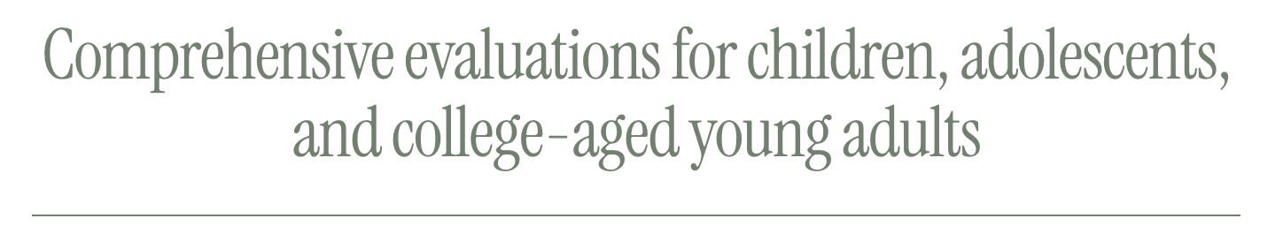 A psychological evaluation helps families understand their child’s behavioral, emotional, and/or learning challenges. This process can be critical for guiding mental health treatment, accommodations for school (e.g., 504 Plans) and college, and modifications to your child’s educational curriculum (e.g., Individualized Education Programs or IEPs).